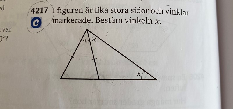 Eftersom den högra triangeln är likbent, förstår jag att dess basvinklar är lika stora och att vinkel x därmed är lika stor som den övre vinkeln i den högra triangeln, men sedan behöver jag lite hjälp på traven. Tacksam för svar!
