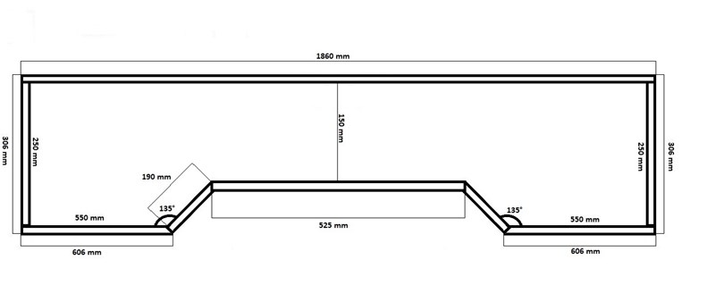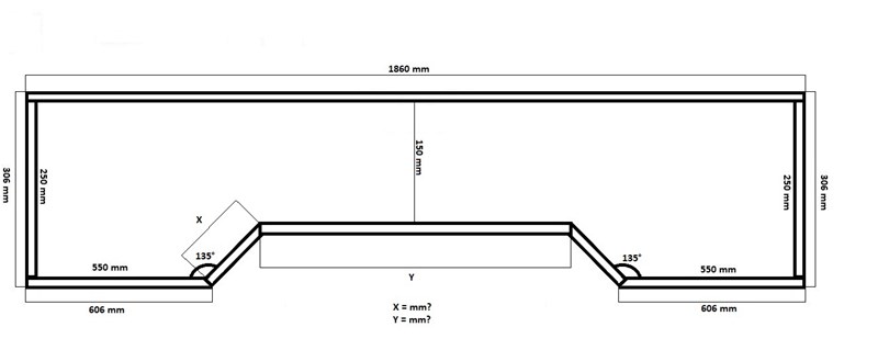 I det första alternativ hittade jag först avståndet mellan bottnen på figuren och linjen där Y fanns vilket blev 100 mm. Om man ritar vågräta linjer vid Y-linjens kanter får man två trianglar, som är rätvinkliga samt likbenta eftersom två av deras vinklar är 45 grader dvs, de två kateterna i trianglarna är likadana. Med avståndet mellan bottnen och Y kan man bestämma hur långa är kateterna, alltså, 100 mm. Då använder man Pythagoras teorem: och får som är ungefär 141,42 mm och det är X-värdet. Med längden på kateterna i de trianglarna, som har redan varit räknat (100 mm) Blir det enkelt att hitta Y-värdet, genom att subtrahera sidan uppe figuren (som är 1860 mm) med de båda linjerna som är 606 mm långa och de två nedläggande kateterna från trianglarna (100 mm var och en) blir det: 1860-1212-200= 1860-1412= 448 mm. Då har vi X=141,42 mm och Y=448 mm. I det andra alternativet där jag antar att tjockleken i linjerna hos figuren spelar roll, vilket jag tycker borde vara så. För att räkna tjockleken hos linjerna gjorde jag såhär: den yttre linjen i vänster eller högern sidan av figuren minus den som finns inre, 306-250=56 och delar den med två och får 28 mm tjocklek om man antar att linjerna är lika tjocka. Det gör att avståndet mellan bottnen och Y-linjen blir kortare än i alternativ 1. Den blir i det här fallet 72 mm, då blir formeln för X-sträckan: som kan lösas som är ungefär lika med 101,82 mm. Y-värdet ändras också eftersom längder på kateterna blir olika, då blir formeln för att hitta Y vara: mm. Alltså X=101,82 och Y=504 i det här fallet.