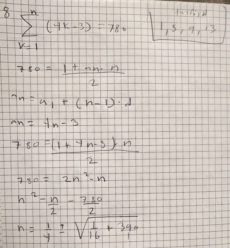 SUM_1^n (4k-3) = 4 SUM_1^n k - SUM_1^n 3 = 4 * 1/2 n(n+1) - 3n