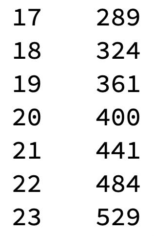 Kvadraterna för stora n är spridda så det är inte så svårt att 'ringa in' dem runt ett 'mål', i detta fallet 400 när 'basen' är 390. Kringliggande värden ligger ca. 40 steg bort i varje riktning och det kan aldrig n/2 kompensera för.