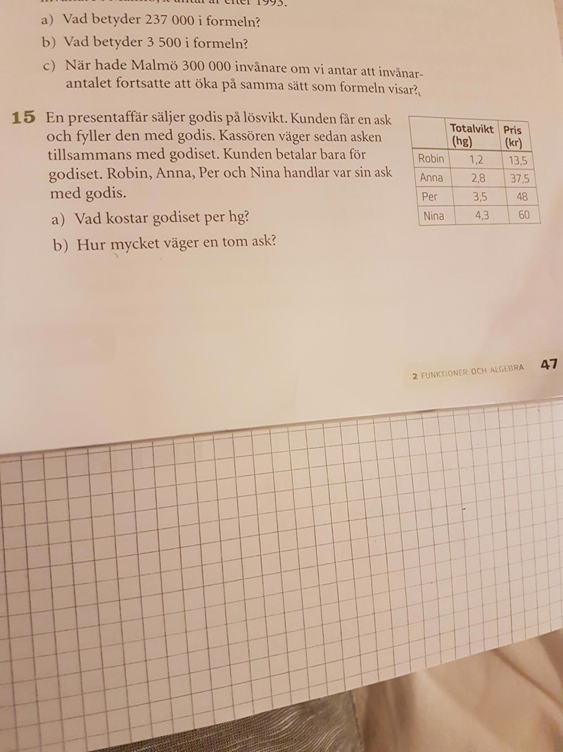 Då handlar Per 3,5-X hg godis och Nina 4,3-X hg godis.