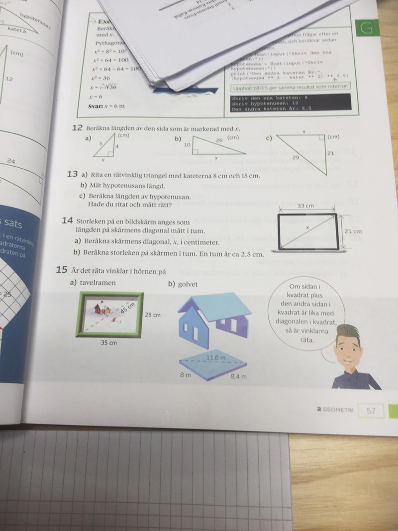Hur räknar man ut diagonalen och tumen ur x? Fråga 14 a och b