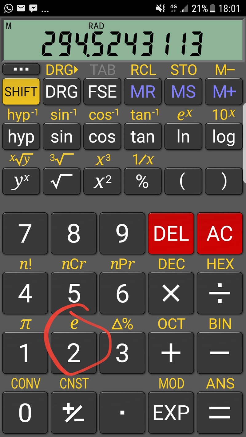Ja jag har e knappen men hur ska jag använda det? Jag har talet 3e upphöjd till 2 och när jag slår på 3 sen knappen e upphöjd till x får jag svar direkt men vart ska jag sätta in upphöjd till 2 då?