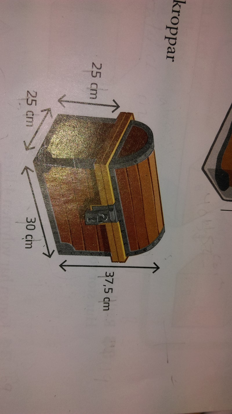 Det ser ut som att överdelen av kistan har formen en halv cylinder. Då har du tillräckligt med mått för att kunna svara på frågan.