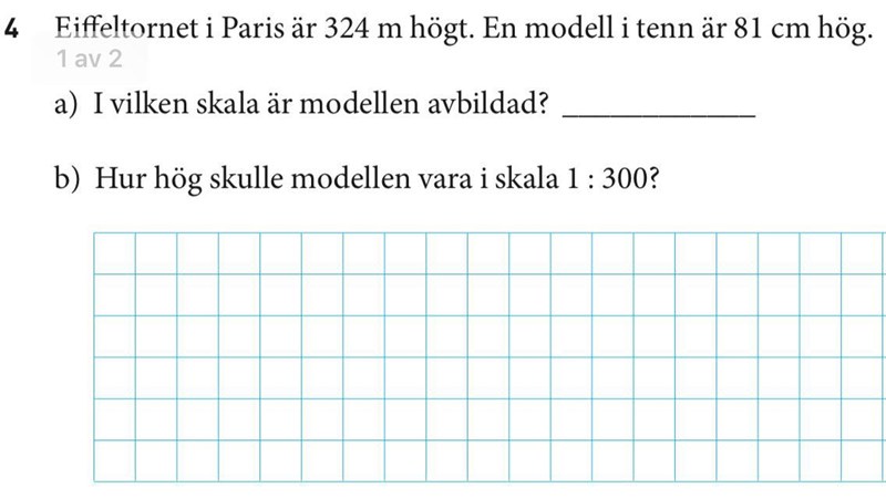 På uppgift a kan du t.ex. Omvandla 81 cm till meter. Det blir 0,81. Hur stor skala är modellen avbildad i om den är 0,81 och Eiffeltornet är 324m.