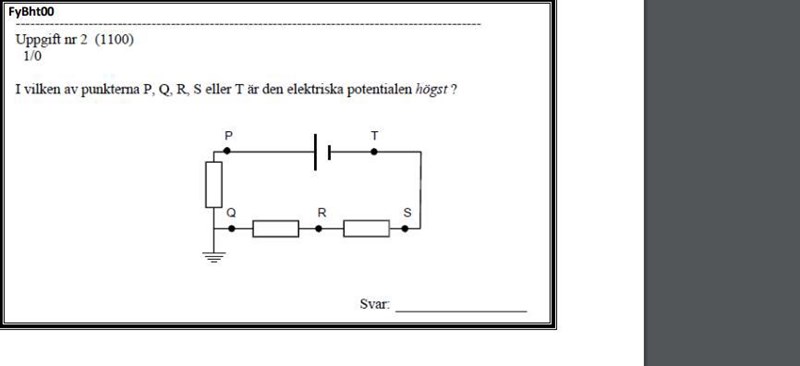 Batteriet har sin pluspol till vänster (det långa strecket). Rita ut hur strömmen går i kretsen. Markera med + och - tecken hur spänningsfallet blir över varje motstånd. Då kan nog lista ut vilken punkt som har högst spänning i förhållande till jord.