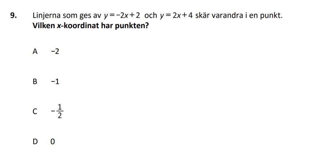 För något värde på x kommer linjerna ha samma y-värde (och x värdet). Sätt de lika med varandra och lös ut x :)