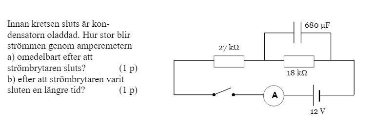JohanF skrev:På uppgift a är kondensatorn oladdad. Det innebär att spänningen över den är noll (se facits uträkning), och hela strömmen tar vägen genom kondensatorn då den i tillslagsögonblicket ser ut som en kortslutning.