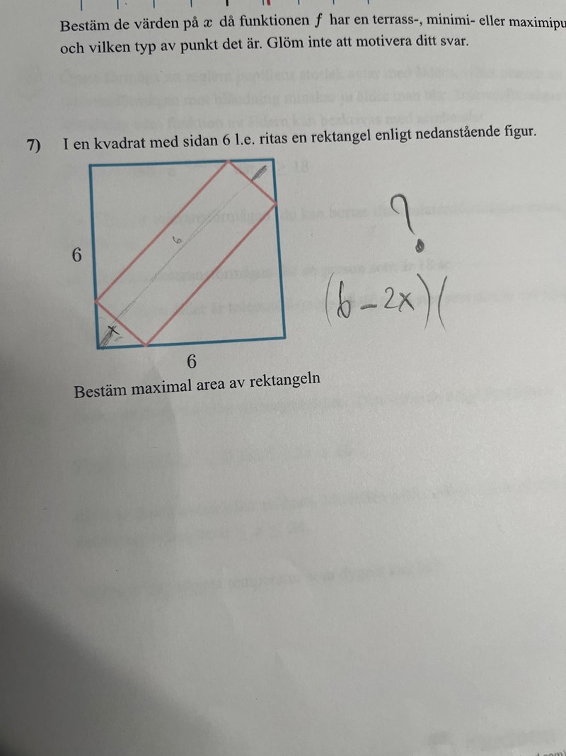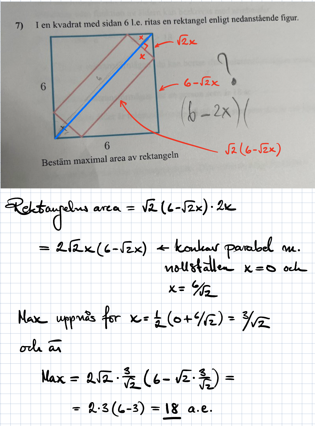 Facit står det att man ska kunna teckna en av rektangelns sida tex roten ur 2x eller roten ur 2(6-x) och jag har ju iaf skrivit längden är 6-2x för jag tänker det är 2 trianglar som är x så man tar bort det från längden 6, förstår inte hur man tänker att korta sidan är roten ur 2x