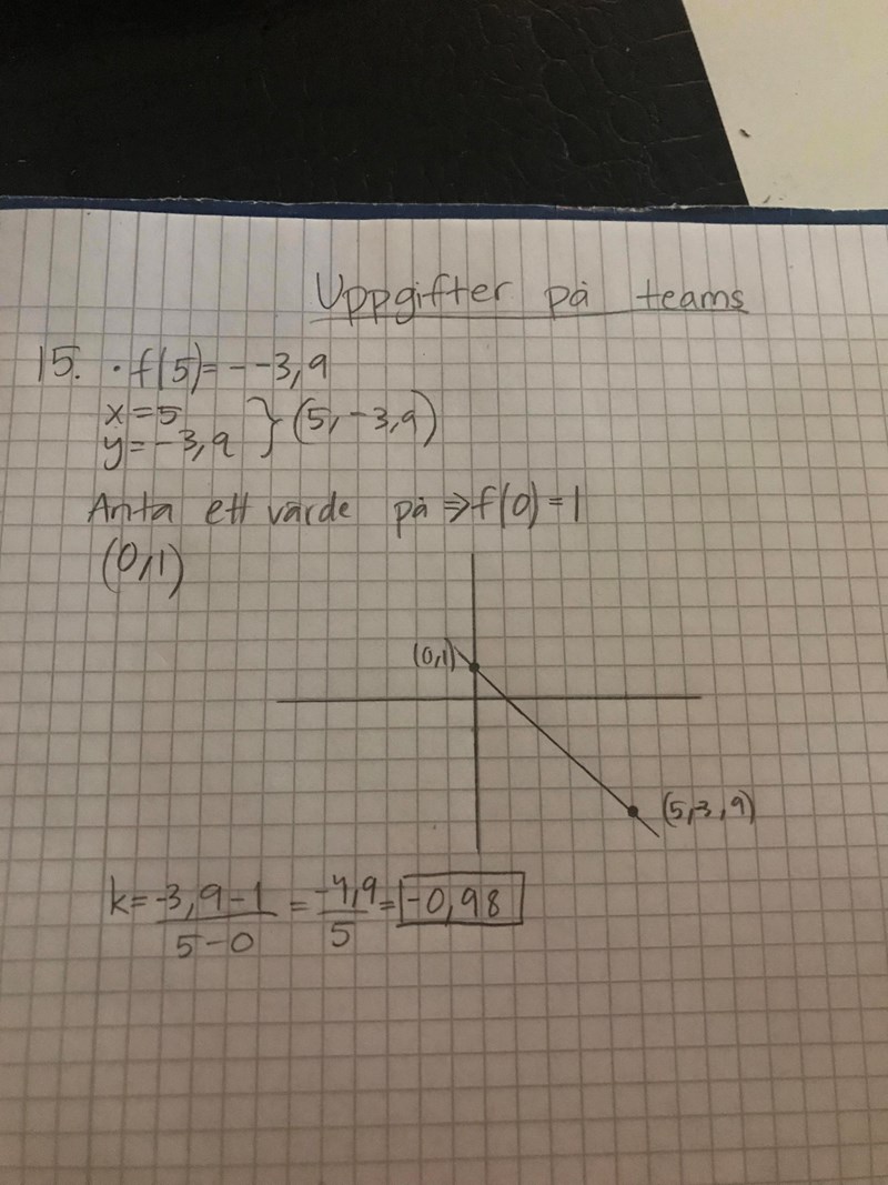 Låt oss bara anta ett värde på f(0), vi tar 1. Rita de båda punkterna (0, 1) och (5; -3,9). Dra en linje mellan dem. Vad är den linjens lutning? Visa bilden också, så fortsätter vi därifrån.