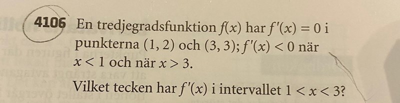 Hej, jag behöver lite hjälp med denna fråga. Uppfattar jag den korrekt om jag skriver ut den så här? Alltså att grafen kommer bli strängt växande mellan 1 < x < 3? Är lite osäker