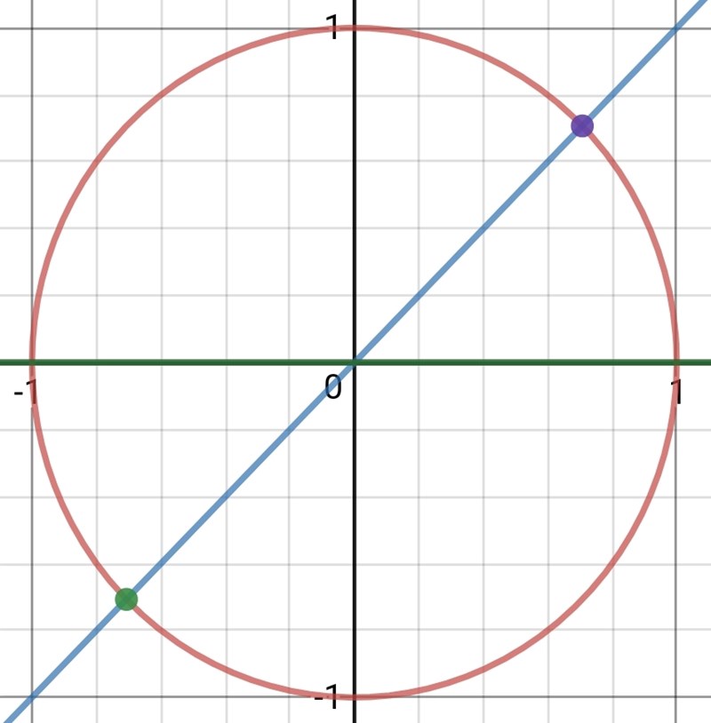 Vänta vänta här.... om vi har enhetscirkeln, och en rät linje som går igenom den, då kommer den gå igenom punkten $$\pm 1/sqrt2, \pm 1/sqrt2$$