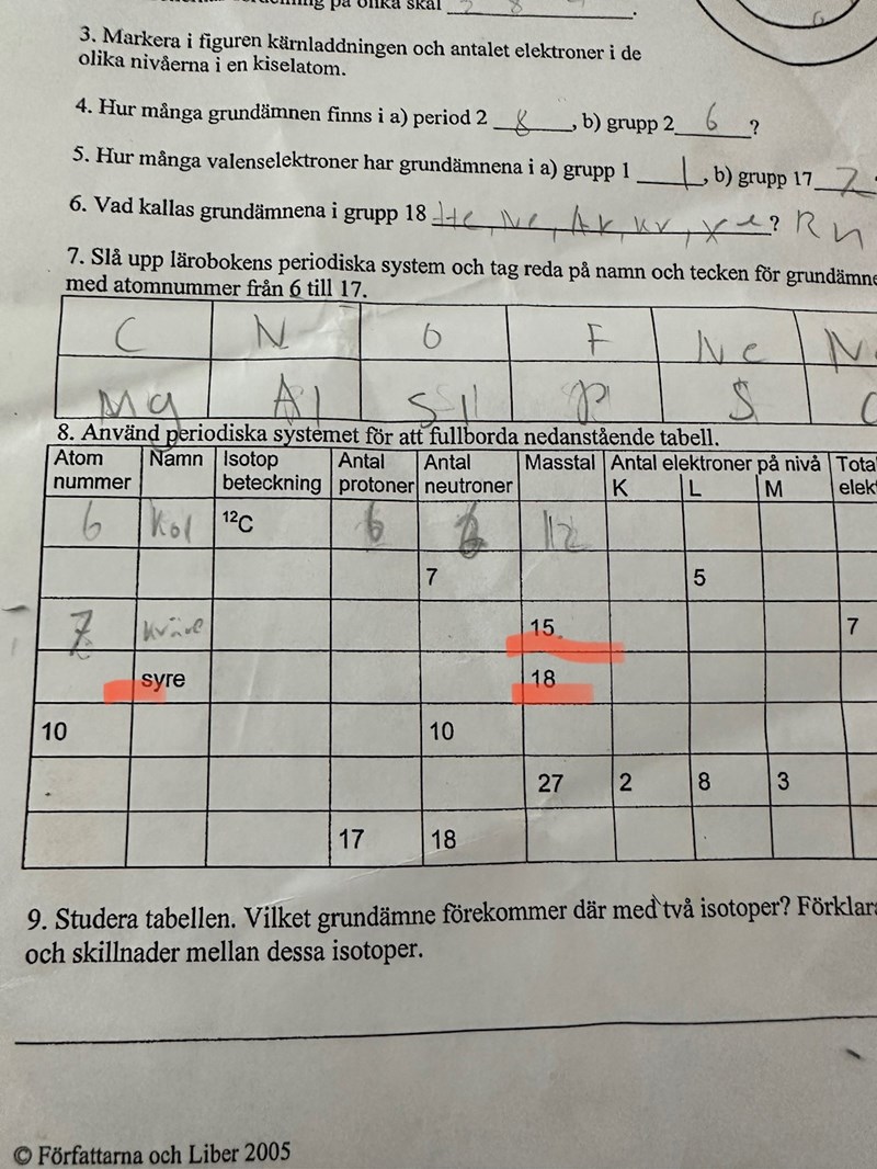 Du ser att atomen har sju elektroner, vilket innebär att ämnet har sju protoner. Om masstalet är 15 finns då åtta stycken neutroner.