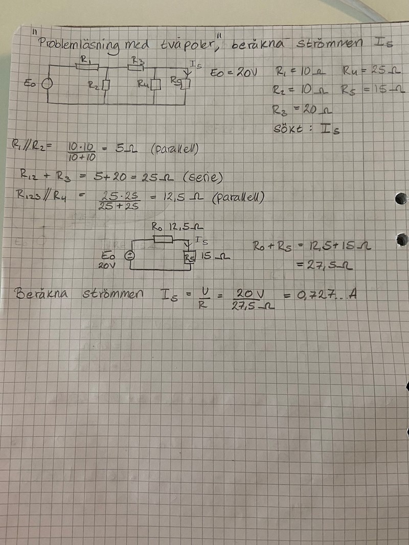 Jag har fått i uppgift att beräkna strömmen I5. Jag började med att beräkna ersättningsresistansen för R12345 som blev 27.5 Ohm. Sedan använde jag Ohms lag för att beräkna strömmen och fick svaret 0.727 som var fel. Vart kan det ha gått snett?