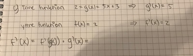 Hej, jag undrar över hur jag ska derivera e^(5x+3). Jag har börjat lite, men har fastnat :/