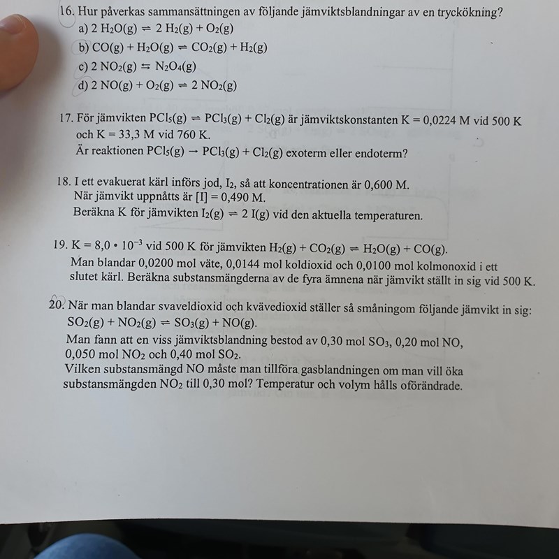Problemet jag tänker är att det står att jämviktsblandning bestod av 0,30 mol SO3, 0,20 mol NO, 0,050 mol NO2 och 0,40 mol SO2. Detta är vid jämvikt, inte innan jämvikt. Ska man gå tvärt om? Som så, hur?