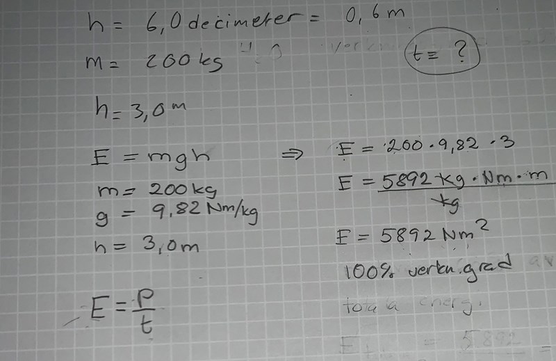 Hur stor energi behövs det för att lyfta lasten med liften? Kalla den energin för Elift. Du verkar ha börjat räkna på detta, men enheten har blivit konstig. Massan mäts i kg, g kan mätas i N/kg och höjden mäts i m. På något sätt har du fått ett m för mycket, och då blir inte enheten Nm = J.