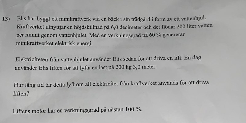 Hur mycket elenergi alstras av minikraftverket varje sekund? (Detta är en effekt som mäts i W.) Ta hänsyn till verkningsgraden.