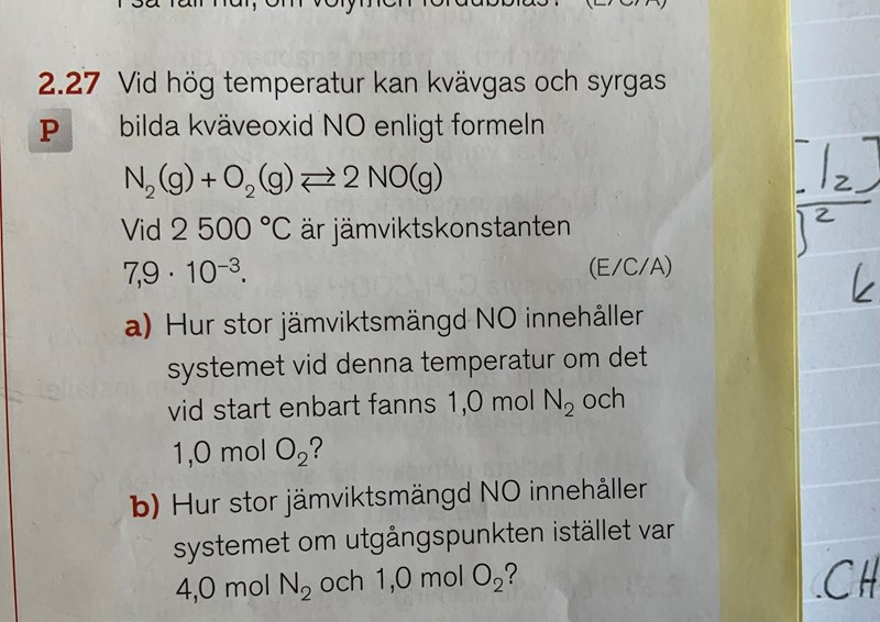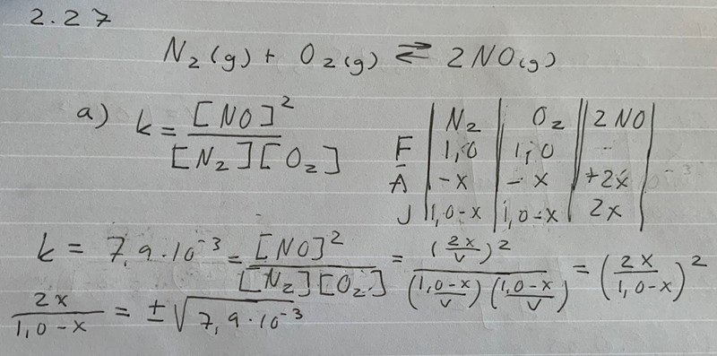 A) I ena fallet har du ett positivt tecken i högerledet. Vad får du då för värde på x? I andra fallet har du ett negativt tecken i högerledet. Vad får du då för värde på x? Nu har du två möjliga värden på x, men enbart ett kan vara rätt rent kemiskt. Vilket då?