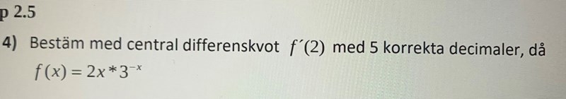 Beräkna [f(2+h) – f(2–h)] / (2h) för h = 0,1, 0,01, 0,001,… tills de fem första decimalerna överensstämmer.