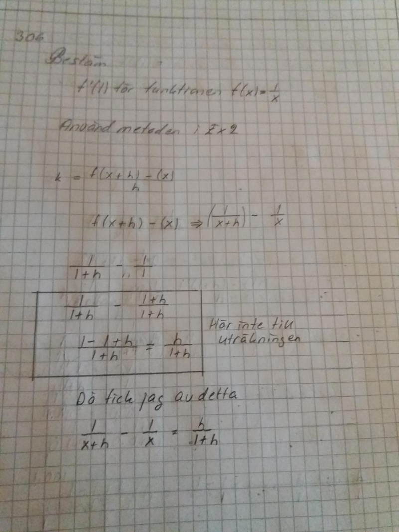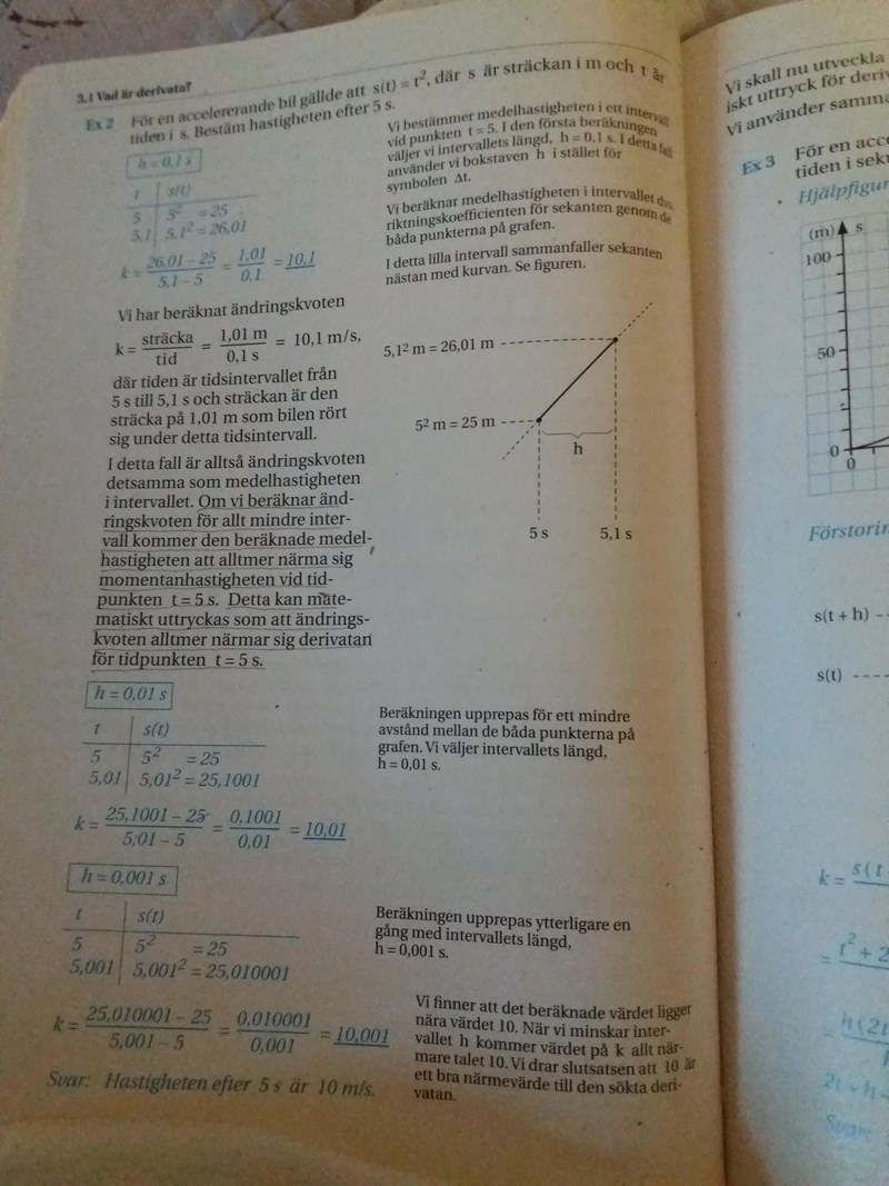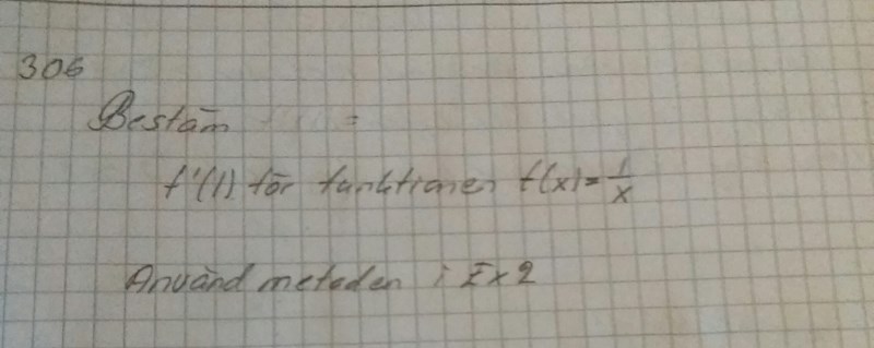 Jag förstår det. Det kommer all säkerhet fram. Jag gör lite uppgifter om derivata eftersom jag går varsamt framåt. Måste få allt i minnet. Kapitlet är ju helt nytt och jag nybörjare inom området. Jag har en hel sida om sammanfattning på det här. Nästa kapitel handlar om deriverings regler. Jag har övnings bok och har övningar på det här området än, innan jag är där.
