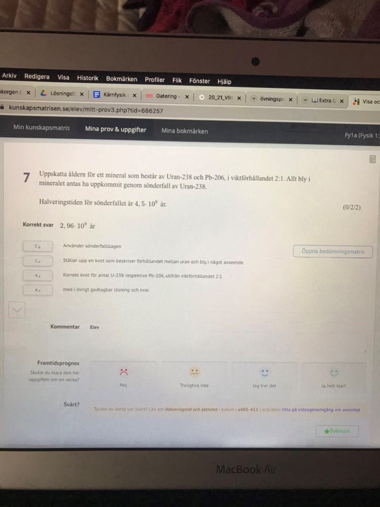 Jag räknade ut lambda genom ln (2)/(4,5*10^9) och använde sedan sönderfallslagen N=N0 * e^(-lambda*t) detta gav sedan N/N0 = e^(-lambda*t) => ln (N/N0) = -lambda*t => t = ln (N/N0) / -lambda. Men jag fick inte riktigt helt rätt svar som givet i facit.