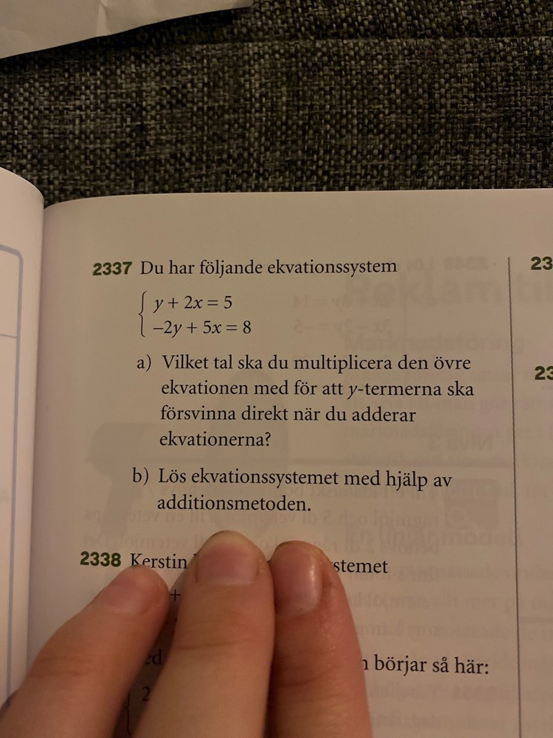 Programmeraren skrev:Vad svarade du på a? Additionsmetoden går ut på att först multiplicera den ena (eller ibland båda) ekvationerna med tal så att antalet x eller y blir noll när ekvationerna sen adderas.