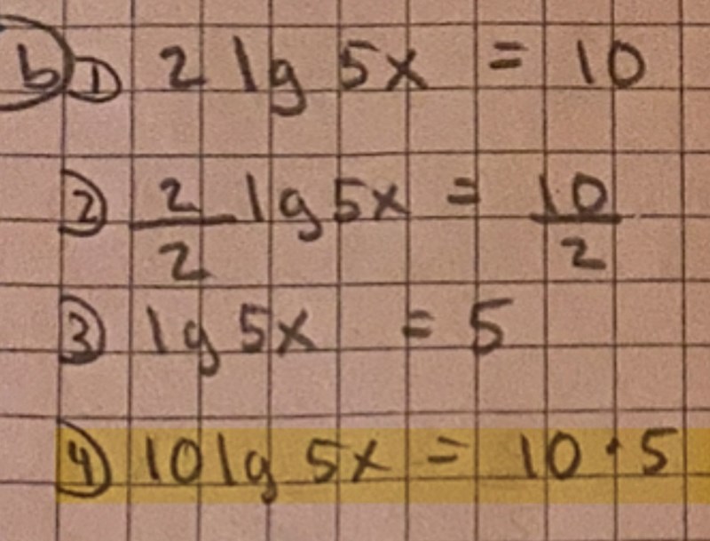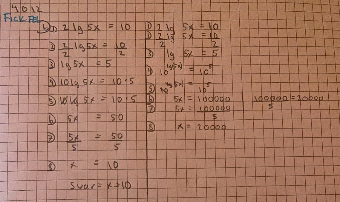 Felet i lösningen till vänster är samma som i din andra tråd: Du blir inte av med lg genom att multiplicera med 10 (se gulmarkerat).