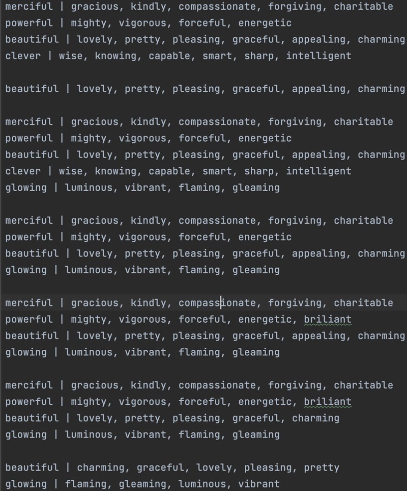 Texten du visar verkar vara hur det kan se ut om man skriver ut vad algoritmen gör medan den arbetar, men jag kan inte riktigt tolka den. Om du har en fil med textsträngar som heter synonymData så är det nog den du ska sortera.