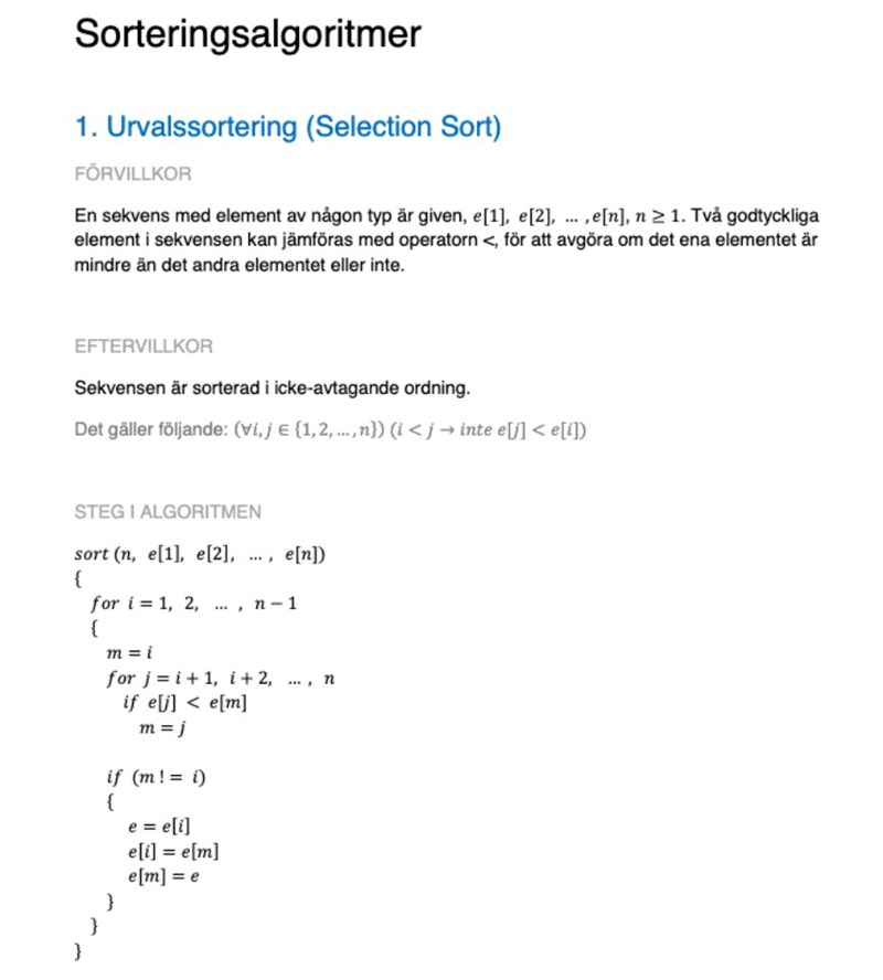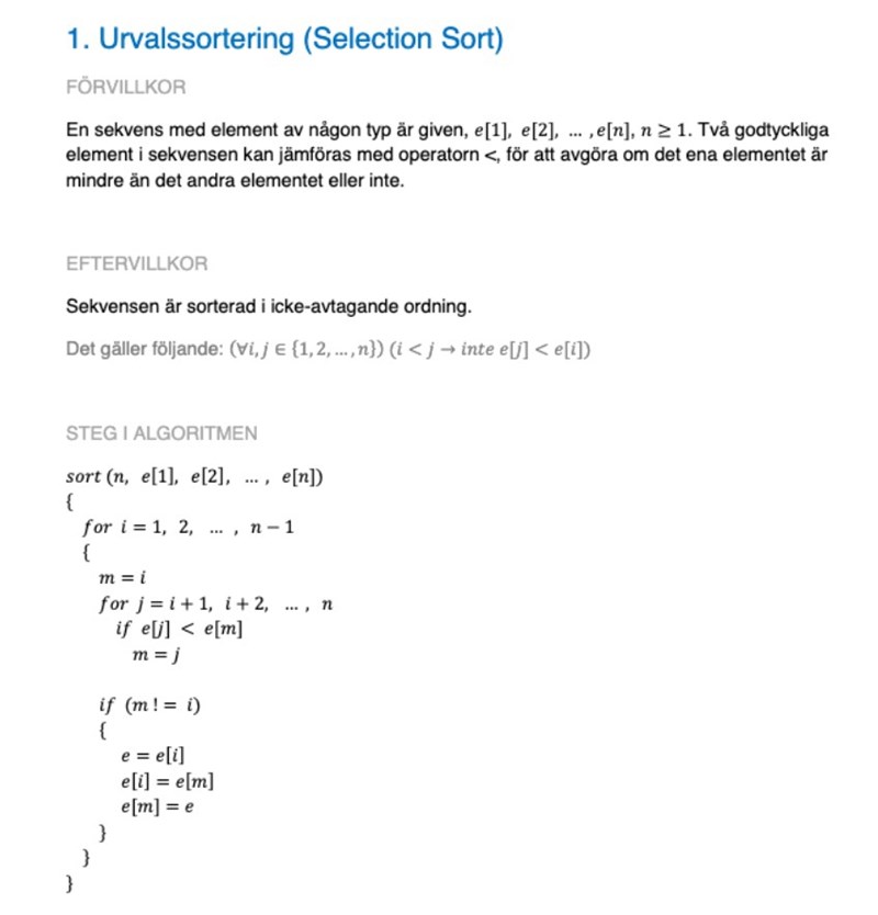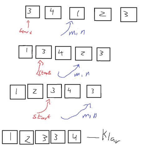 Selection sort är väldigt simpel. Det man gör att man letar upp det minsta elementet, och slänger den sist i litan. Nu hittar man det nya minimum från en index fram:
