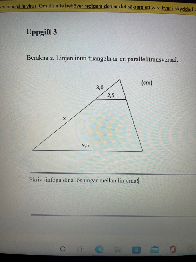 Sidlängderna du ska använda är 3,0 cm, 2,5 cm, (3,0 + x) cm och 9,5 cm.