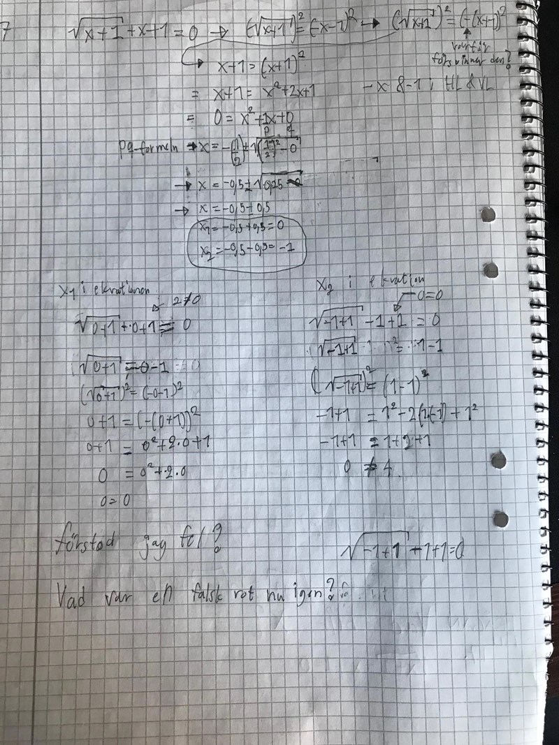 Tack så mycket för hjälpen. Jag fortsatte med uträkningen och stötte på ännu ett problem, (kan vara för att jag är väldigt osäker på mig själv). Svaret ska ju bli x = -1, så varför fungerar x1= 0 och inte x2 = -1? Jag har också glömt bort vad falsk rot är för något, kan inte hitta i mina anteckningar. Vad har jag gjort för fel?