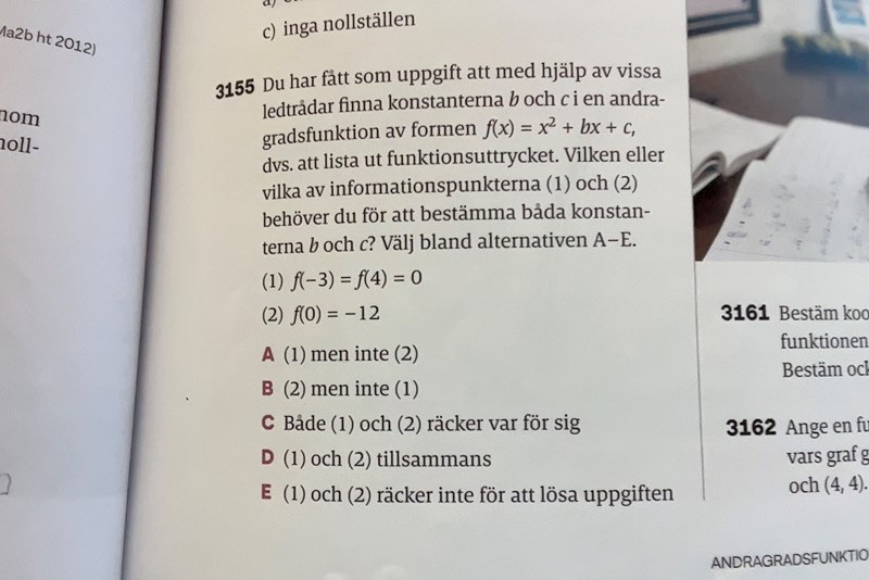 Känns som att de stal denna uppgift från högskoleprovet! Finns många frågor med denna struktur. Frågan undrar vilken bit av information som behövs för att svara bestämma och . Kan du lösa ut och bara med informationspunkt 1? Kan du lösa ut dem med bara informationspunkt 2? Behöver du båda informationspunkter för att bestämma och ? Hur mycket information behövs?