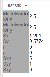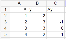 Testade detta i GeoGebra, där våra Δy då blir {-1, 0, +1}. Inget linjärt samband alls! Det går alltså inte att förutsäga om x+1 ger y+1, y+0 eller y-1.