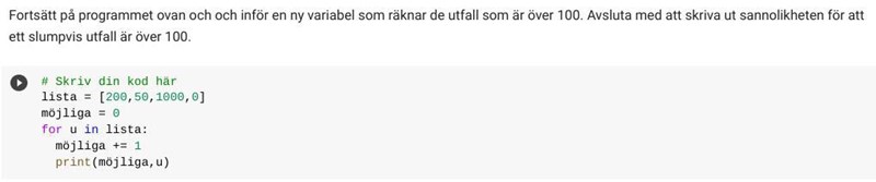 På sista står det inte att du ska skriva ut nånting i loopen, bara sannolikheten, på slutet.
