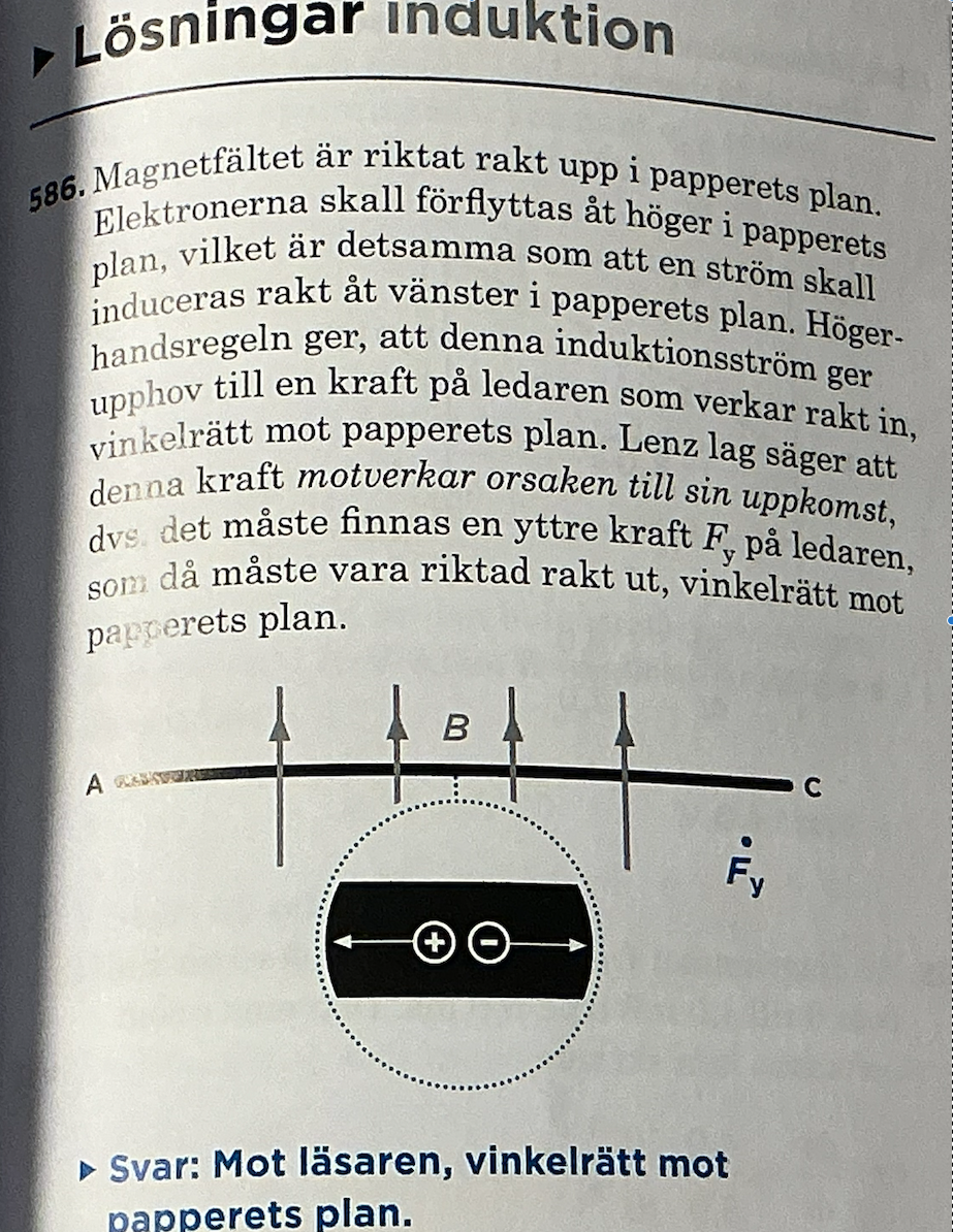 och jag håller med dig att facits lösningsförslag är svårt att förstå, med ett onödigt omständigt resonemang (fast det är inte fel). Jag förstår inte riktigt vitsen med det indirekta sättet att resonera kring hur den inducerade laddningsförskjutningen (mycket mycket kortvarig ström) i ledaren skapar en kraft på ledaren (F=BIL) som försöker motverka den kraft som skapar ledarens rörelse och laddningsförskjutningen i ledaren.