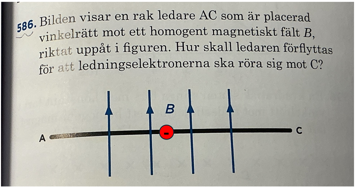 Ok. När jag använder vänsterhanden för F = qvB och riktar handflatan åt höger (kraften åt höger) pekar tummen rakt utåt mot läsaren? Motsvarar detta att ledaren måste röra sig rakt utåt, och att det därmed krävs en kraft rakt utåt? Hur kommer lenz lag in och en ström åt vänster, som facit nämner? Är mycket förvirrad. Har löst klurigare uppgifter än denna men ändå upplever jag den som en svår uppgift.