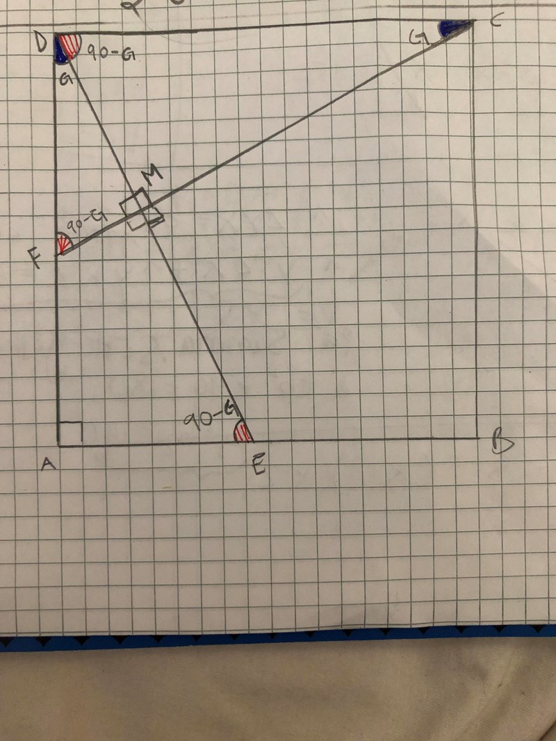 Den här uträkningen verkar vara rimligast. Så här tänker jag. Vinkeln vid triangeln CDF = 90. Den vinkeln delar jag upp där jag kallar den ena för G och den andra ”röd markerade” vinkeln för 90-G. Om vi tittar på triangeln DFM så kan vi dels se att det finns en rätvinkel, en G vinkel (blåa färgad). Den sista vinkeln i triangeln DFM blir då 180-(G)-(90) = 90-G. Vilket är lika stor som vinkeln CDM .Nu tittar vi på den större triangeln DAE . Den triangeln har vinklarna 90 och G. Den sista vinkeln blir 180-90-G=90-G. Vilket är lika stor vinkel som de andra röd markerade vinklarna (se bild).