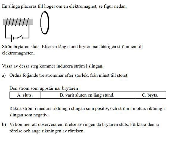 jag vet att man ska använda sig av lenz lag jag tror att det kommer bli strötst ström vid sluts eftersom slingaren kommer påvarkas av detta . Jag fatter inte fråga b
