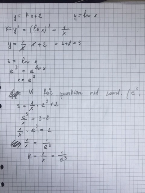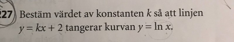 Hej, jag behöver hjälp med denna uppgift... Jag har börjat derivera funktionen y = ln x och får y’ = 1/x = k. Men hur ska jag sen fortsätta?