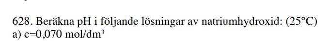 Det som jag tycker är konstigt är att man inte får veta hur mycket vatten det fanns från början. För natriumhydroxid kommer ju lösas upp enligt NaOH(s) → Na+(aq) + OH-(aq). Då tillsätts det ju en mängd hydroxidjoner. Men i vattnet från början fanns det ju också en mängd hydroxidjoner på grund av vattnets autoprotolys. Men eftersom man inte vet hur mycket vatten det fanns innan man tillsätte saltet vet man ju inte hur stor koncentrationen var innan. Alla hydroxidjonerna kommer ju inte från saltet, menar jag.