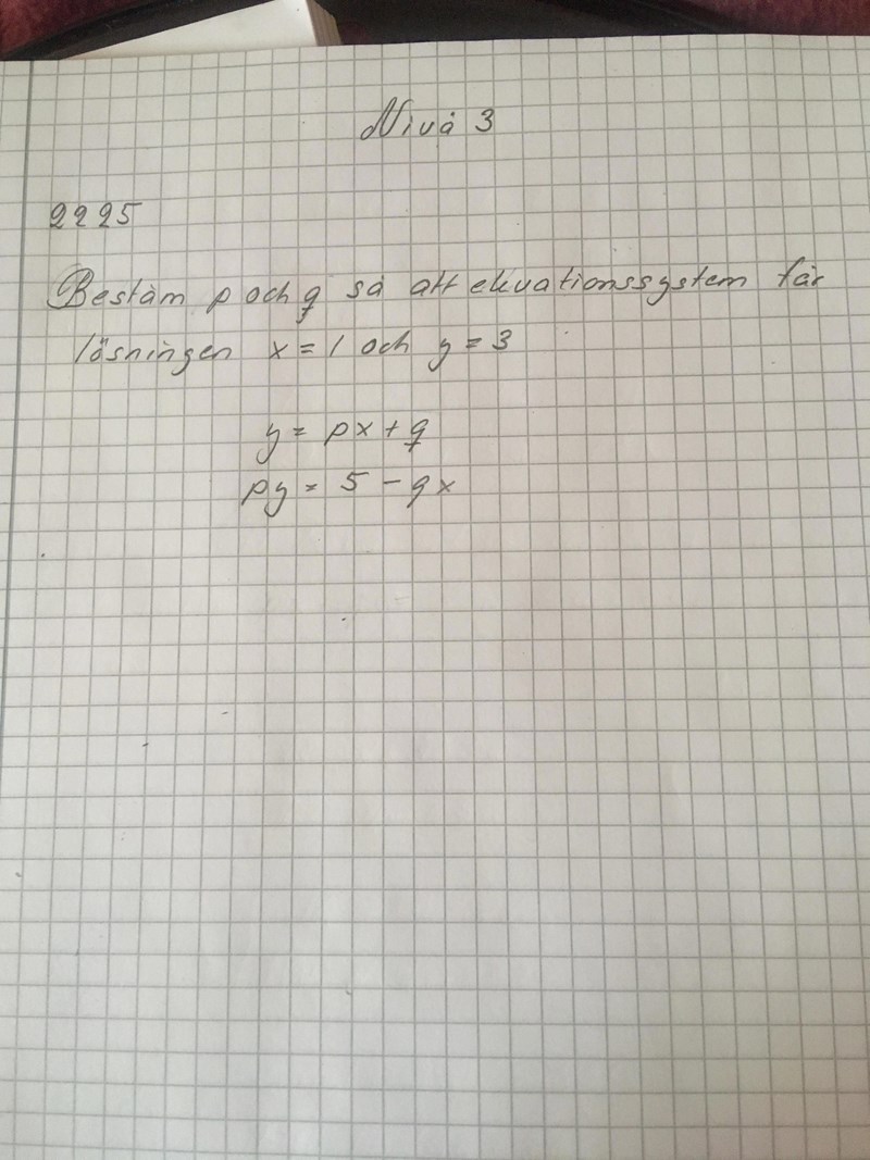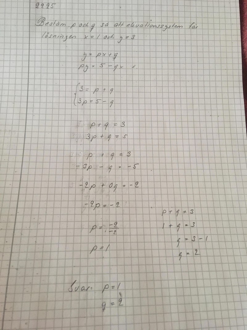 Om du sätter in att x = 1 och y = 3 i de båda ekvationerna får du ett linjärt ekvationssystem med tå obekanta (p och q). Detta ekvationssystem kan du lösa på valfritt sätt (jag skulle ha valt substitutionsmetoden och löst ut q ur den första ekvationen, men det går lika bra att använda additionsmetoden om man föredrar det).