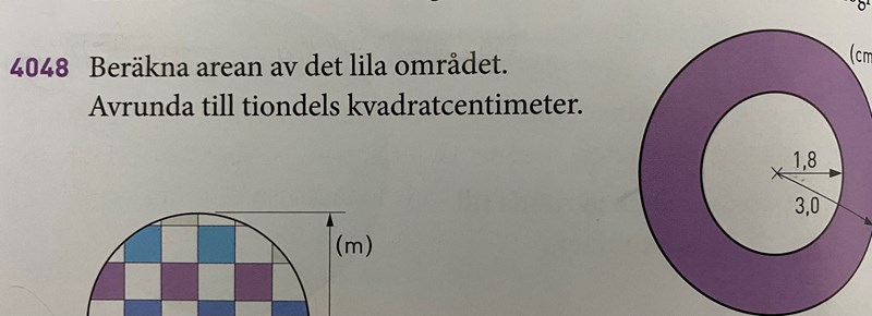 Jag vet hur man börjar. Jag räknade först ut stora cirkelns area och det är 28,27433... kvadratcentimeter och sedan räknade jag ut lilla cirkelns area vilket blev 10.18... och massa decimaler. Men jag förstår inte hur man ska subtrahera dem på miniräknaren för det är ju oändligt många decimaler. Får man avrunda dem? Måste man alltid avrunda i slutet? Ska jag ta med några decimaler bara? När jag löser andra uppgifter så säger lärarna att man ska alltid avrunda i slutet för annars får man fel svar. Men hur ska jag göra här?