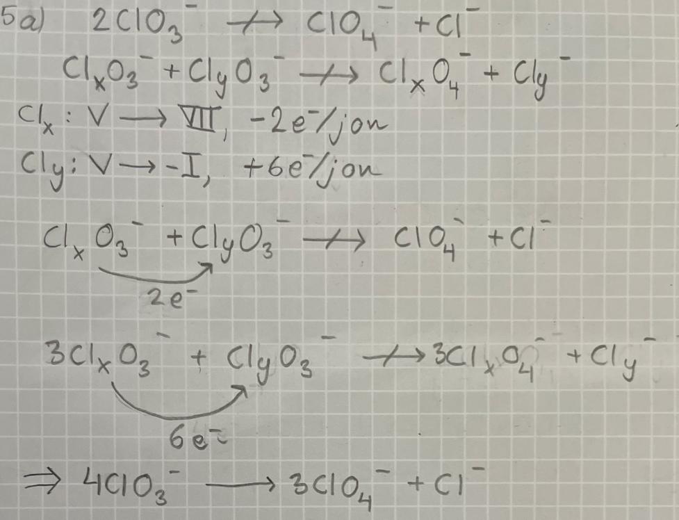 Jag tog bara ett genomsnitt från högerledet. I ClO4- har klor +7 som ox-tal och i Cl- har den -1. Då tog jag ett genomsnitt på dem och det blev 3. Men uppenbarligen fungerar inte det. Hur ska man göra istället?