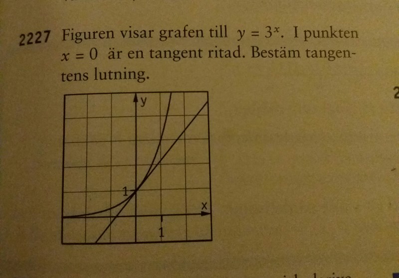Tangentens lutning i punkten är lika med derivatan . Funktionen har derivatan där betecknar den naturliga logaritm-funktionen.