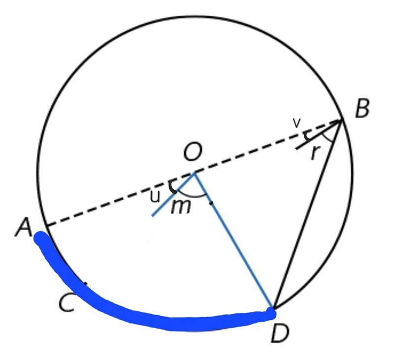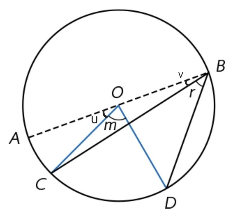 Vinklarna r och m kan skrivas som differensen mellan två andra vinklar:r = ∠ABD − ∠ABCm = ∠AOD − ∠AOC == 2 ⋅ ∠ABD − 2 ⋅ ∠ABC == 2(∠ABD − ∠ABC) = 2r.