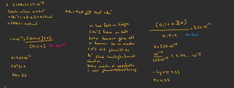 Jag vill beräkna PH i en lösning som består utav en koncentration syra och dess korresponderande bas som har tillkommit m.h.a en salt. Jag vet däremot inte hur jag ska ställa upp jämviktsekvationen. Ovan så har jag gjort det på två på två olika sätt men vet inte vilken som är rätt båda är rimliga.