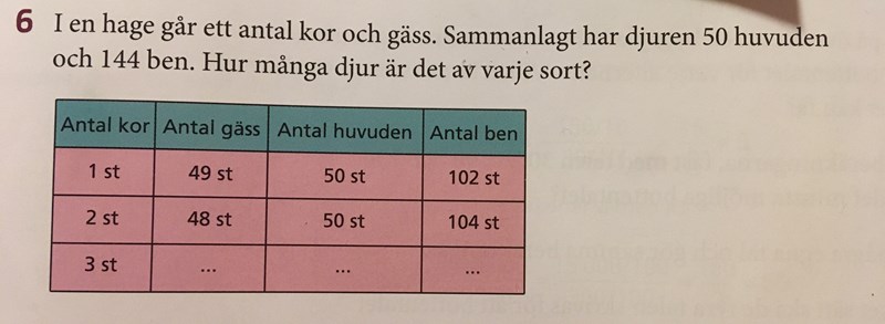 Pröva därför med 4 kor istället. De tar upp 4*4 = 16 ben. Kvar blir då 144 - 16 = 128 ben till gässen. Varje gås har 2 ben så det blir 128/2 = 64 gäss. Totalt blir det 4 + 64 = 68 djur, vilket fortfarande är för många.