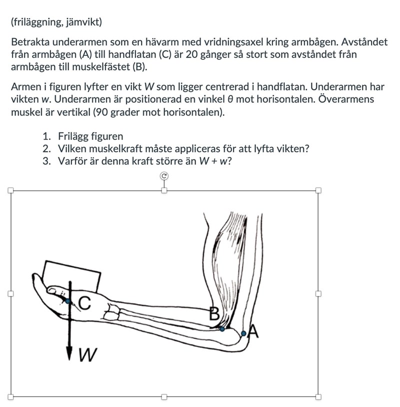 Krafterna som verkar på armen är tyngden från vikten och från själva armen samt kraften i biceps (muskeln på överarmens framsida).