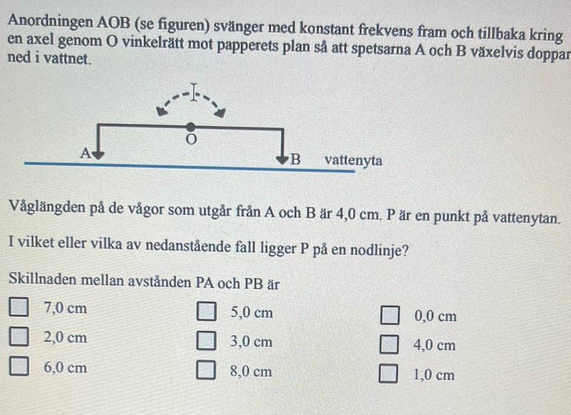 Det står i uppgifttexten att "anordningen AOB svänger med konstant frekvens fram och tillbaka". Det betyder att om det är en periodtid T mellan två på varandra doppar med spets A i vattnet, så doppar spets B i vattnet mitt emellan spets A, dvs tiden T/2 efter spets A's dopp, och T/2 före spets A's nästa dopp.